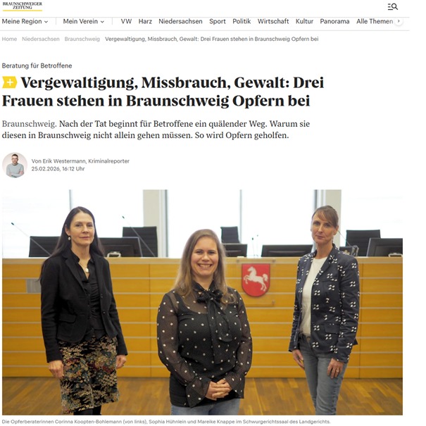 Anlässlich des Bezugs unserer neuen Beratungsräume im Landgericht Braunschweig hat die Braunschweiger Zeitung einen sehr interessanten Bericht über das Opferhilfebüro Braunschweig veröffentlicht.
